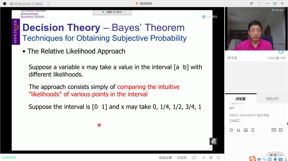 此次“Risk, Performance and Decision Analysis / 风险,绩效与决策分析”课程共32学时,Jian-Bo Yang教授采用腾讯课堂进行线上授课。在授课过程中,他从基本概念、理论方法、实例模型等方面为公司员工讲授了风险与决策树分析、效用决策理论、贝叶斯决策理论、多准则决策分析、数据包络分析与效率评估等内容。针对讲授的不同决策方法模型,Jian-Bo Yang教授结合自己承担的研究项目和当前的最新研究成果,给出了具体的项目实例,与员工进行了深入的分析与讨论。此外,Jian-Bo Yang教授还分享了团队自主开发的智能决策系统工具软件,供同学们学习与研究。授课结束后,Jian-Bo Yang教授以Course Report的形式对员工进行成绩考核。