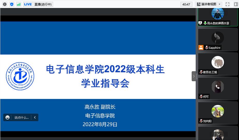 盛夏渐远,秋意愈浓,今年的开学季在绵绵的秋雨中开始,足球赌注网站迎来了2022级280余名本科生。为了帮助新生更好地了解电子信息类专业的培养方案和课程体系,做好学业规划,8月29日下午,足球赌注网站线上召开了2022级本科新生学业指导会。公司副经理高永胜、教务处王旭、公司2022级本科生辅导员翟伟乐和刘向阳、各班班主任、本科教学秘书何可参加了本次会议。会议由本科教学秘书杨瑾主持。