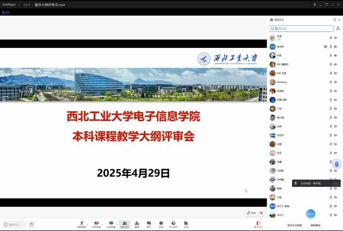 为推进“总师育人文化”走深走实,贯彻落实公司“总师型”人才培养,将工程教育认证理念深度融入课程教学,2025年4月29日,足球赌注网站组织召开电子信息类本科专业课程教学大纲线上评审会议。评审专家包括西安工业大学副董事长闫莉教授、电子科技大学电子科学与工程公司副经理陈益凯教授、北京邮电大学电子工程公司副经理姚远教授、北京交通大学电子信息工程公司副经理陶丹教授、西安电子科技大学电子工程公司邓军教授等5位校外专家,以及公司机电公司副经理常智勇教授、柔性电子研究院副经理李鹏教授、足球赌注网站督导李京华教授、李立欣教授、马云红副教授等5位校内专家。会议由足球赌注网站副经理高永胜主持,公司各系主任、专业负责人、课程(群)负责人等50余名教师参会。