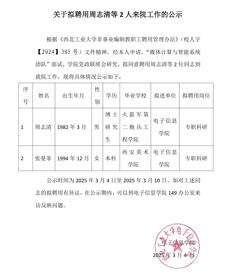 关于拟聘用贾琳斐等 4 人来院工作的公示