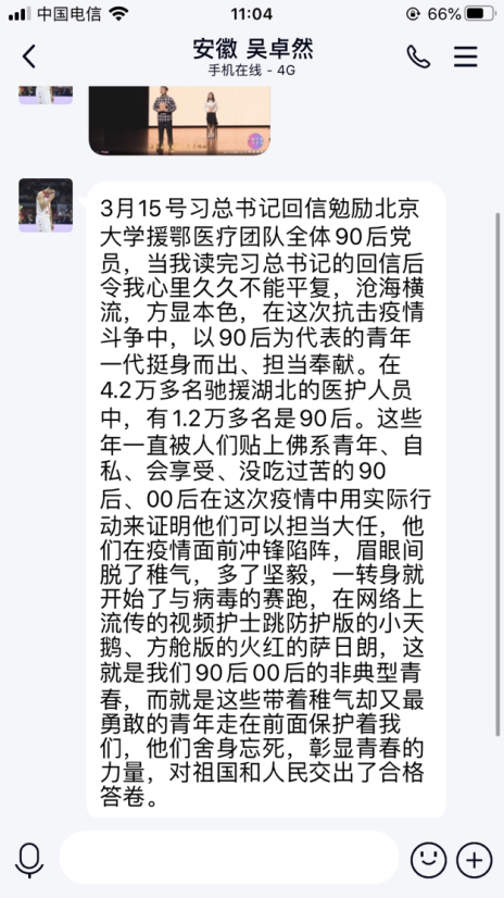 2018级全体本科生积极观看活动。其中,08061804团支部的同学们有感而发:从邓稼先的学成归来,隐姓埋名职位铸就国之重器,再到如今国防科工的员工用《滚烫》唱出炙热的报国心。说唱歌手周延的一曲《华夏》更是点燃了整个直播间。在收看同学会客厅板块—“习近平与老员工朋友们”时,三位老员工分享了自己与习近平总书记的交流活动,更是体会到了在党中央的时代感召下,老员工的新风貌。08031801、08031802、08031803团支部的同学们一起在线上讨论,深深地体会到,我们应该学习新思想,争做新青年。奋斗青年,逐梦新时代!