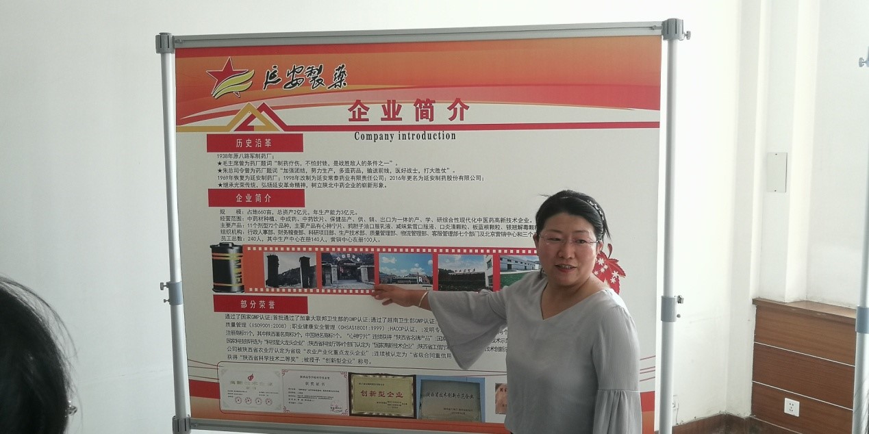 到达之后,企业办公室的折晓霞经理接待了队员们。首先,她向队员们介绍了企业的相关情况,包括企业文化、出口贸易、自主研发、公益事业、重大科技项目及成果、科研项目以及之后准备建成的延安医药卫生纪念馆。在队员们对企业有相关了解之后,折经理带领参观了放置药物的仓库,参观过程中详细介绍了企业的标志所代表的含义,以及该企业的主要生产药物——心神宁片,口炎清颗粒,板蓝根和鸦胆子油口服乳液等。