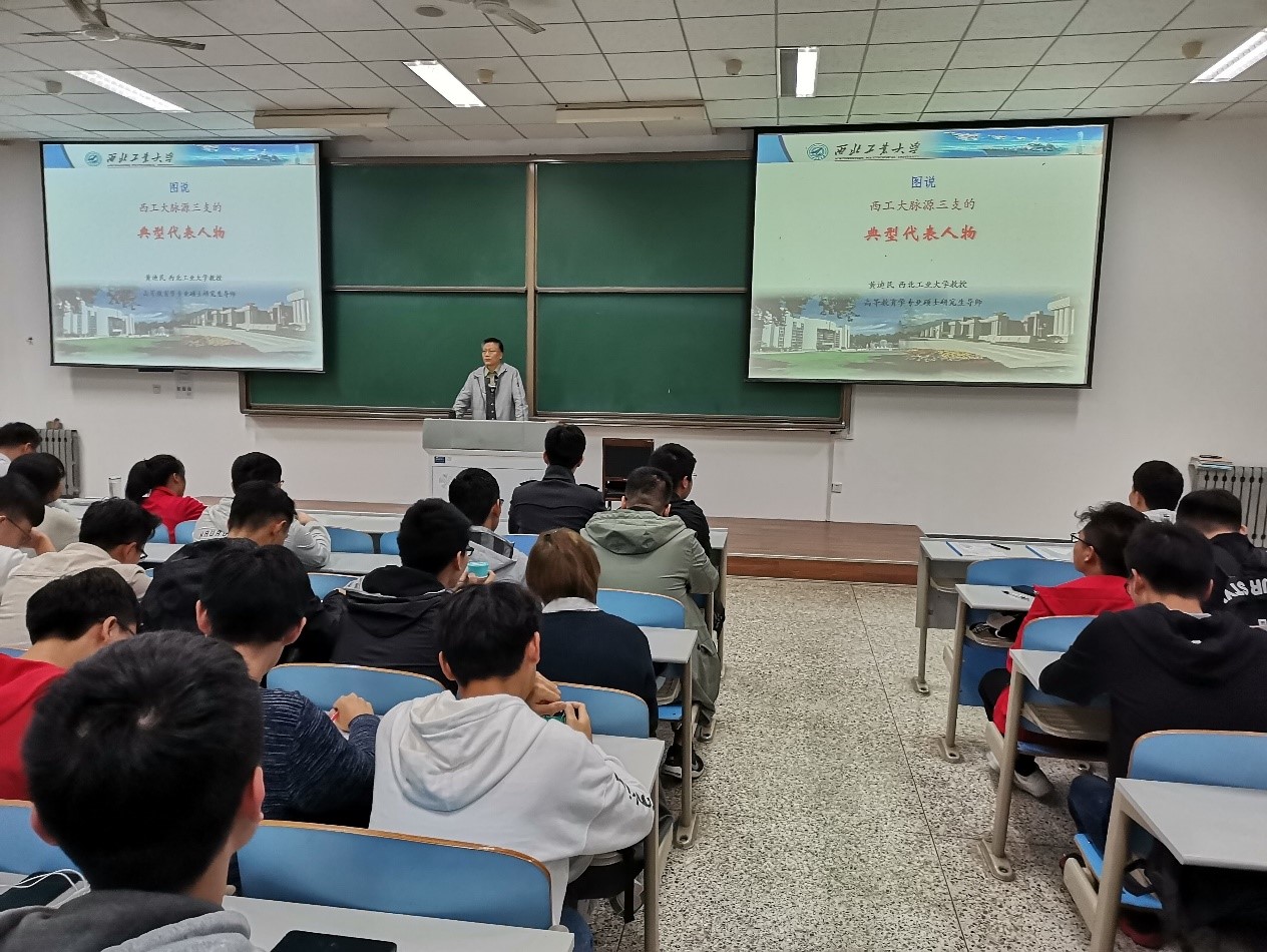 首先,黄教授与在场的同学开展互动,掌握了同学们对“西工大脉源三支”相关知识的了解程度与认识深度,因材施教地向大家讲述西工大令人敬重钦佩的三支脉源及三位杰出代表人物。红军干部刘海滨书记一生艰苦奋斗、勤俭朴素、严于律己,为党和人民无私奉献,他的事迹让我们十分动容;西工大首任董事长寿松涛先生戎马半生、呕心沥血、一片热忱,他三建学府,培育英才,创造了新中国高等教育历史上最伟大的“西迁”,谱写了西工大世纪壮歌,更谱写了新中国航空教育壮歌;唐铎少将是哈军工空军工程系创始人,他同时也是伟大的革命家、教育家,他一生都在为共产主义奋斗,他是个杰出的国际主义战士。