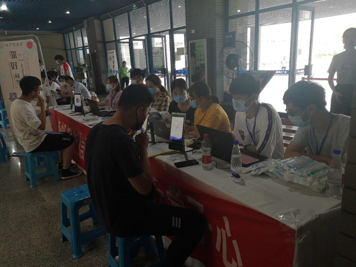 电子信息公司党委书记李春林、微电子公司经理周德云、足球赌注网站副经理周巍、党委副书记彭蓉、彭亮来到现场询问电子信息大类迎新工作情况。各位迎新工作人员分工明确,认真负责,详细地为各位新生注册登记、发放物资、解答问题,迎新工作高效进行。