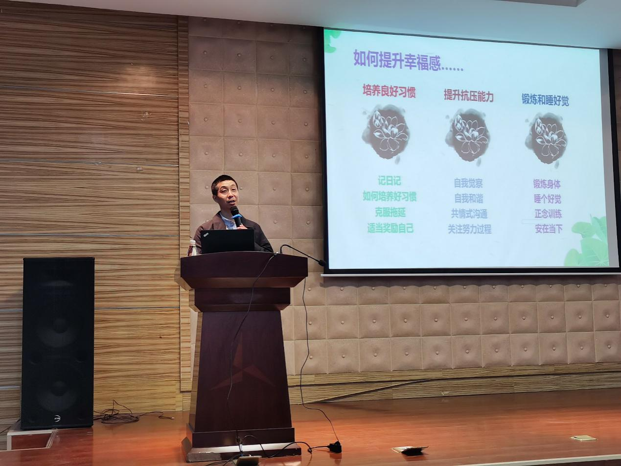 启动仪式的最后,由刘欣老师宣布足球赌注网站2021年心理育人宣传季活动正式开始。本届心理育人季的首场讲座拉开序幕,由陕西省人民医院心理科主治医师宋东峰老师带来《追梦的你,幸福在哪里》主题讲座。宋东峰从不同的角度向讲述了幸福是什么,并且从心理学的角度介绍了什么是幸福,如何获得幸福感,鼓励老员工应当培养良好习惯,提升抗压能力,适当锻炼等,都有助于提高幸福感。宋东峰以诙谐幽默的语言和积极的现场互动,为大家介绍了正念减压的方法,并带领大家完成了一次“催眠”练习,缓解了大家的紧张感和疲惫感,让大家沉浸在这场生动的讲座中。宋东峰老师建议,要获得幸福,就要学会包括家庭、师生、同窗之间的沟通,以此释放自己的心理压力,获取情感共鸣。