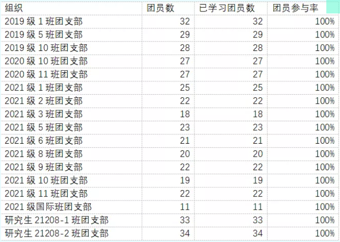 在本期学习中,足球赌注网站青年大学习保持参与人数全校第一,共有17个班级支部学习完成率达100%,在此对这些团支部提出表扬!