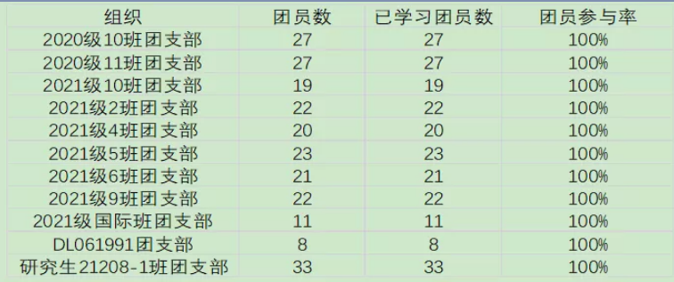 而19208-1、19208-3、19208-6、08061806、08061802、19208-4团支部团员参与率较低,甚至为零,希望这些支部在后续的学习中可以提高积极性,按时完成学习任务。