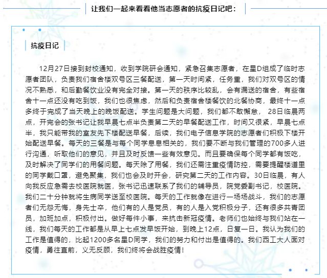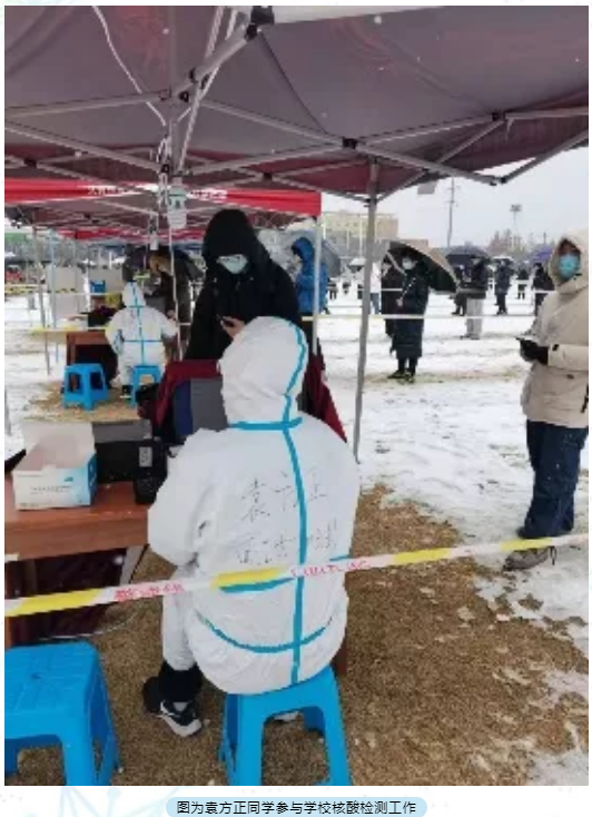 他说,疫情当前,作为一名青年学子应该主动承担疫情防控的责任,去做一些自己力所能及的事情,为抗击疫情贡献自己的力量。志愿者招募群里,每一次的招募,总能收到同学们成百上千句“我可以”的答复,彰显了工老员工的担当。圣诞节当天的疫情检测,因为下雪和寒潮室外温度较低,所有志愿者和医护人员都十分辛苦,手冻得不灵活,就用暖贴捂一捂继续检测,身上落满了积雪就掸一掸继续工作,所有人都坚守自己的岗位,希望通过自己的努力,可以让参加核酸检测的同学老师可以更快更方便的完成核酸检测工作。凛冬散尽,星河长明,西安加油。