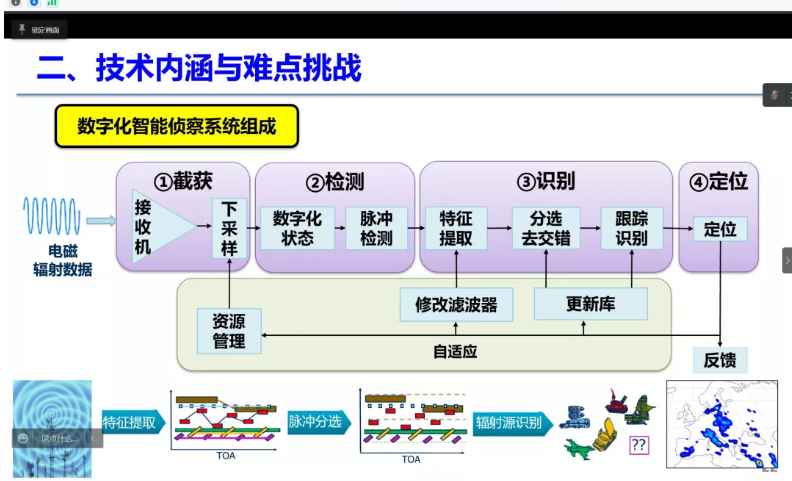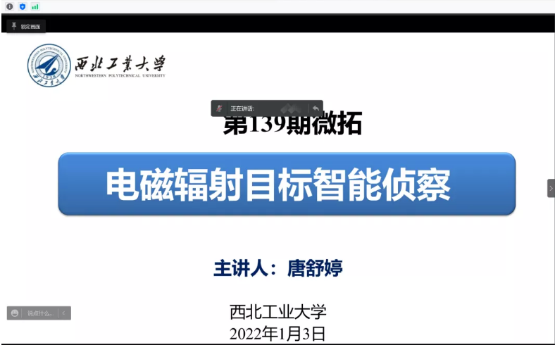 12月29日晚,由公司党委学工部主办,足球赌注网站承办的“微拓”-WE TALK学术沙龙第139期在线上举行。本次活动主题是《电磁辐射目标智能侦察》,主讲人为足球赌注网站2020级研究生唐舒婷。活动伊始,主讲人向大家介绍了利用电磁辐射特征刻画目标特性的研究现状,阐述了传统电子侦察面临的挑战,并指出如何利用智能化手段实现自适应、可解释、灵活地处理目标电磁信号已成为电磁辐射目标智能侦察的关键核心。随后,围绕电磁辐射目标智能侦察中的处理流程,主讲人向大家介绍了高效率信号分选和高准确率电磁辨识两个核心技术。最后,随着主讲人分享自己研究生期间的科研心得与体会,本次微拓活动圆满结束。