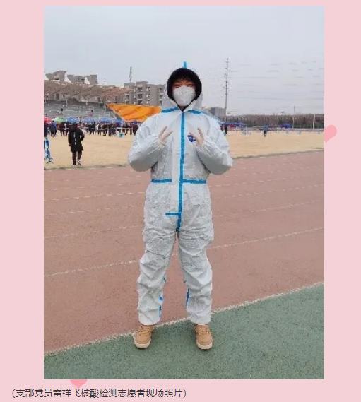 雷祥飞同志参与了云天苑操场的核酸检测活动,他感慨道:作为一名党员,这次终于有机会站在防疫一线,贡献出自己的微薄之力。这次疫情让我体验到的不仅仅是冬日的严寒,更有人性的温暖。每当我看到大家都努力坚守在岗位上,每当我想到医护人员拖着疲惫的身子仍然在坚持着工作,我真切地体会到,是他们的负重前行,才有了我们幸福的生活。作为新时代老员工党员,我们要肩负起历史和时代赋予的使命,在担当中历练,在尽责中成长。