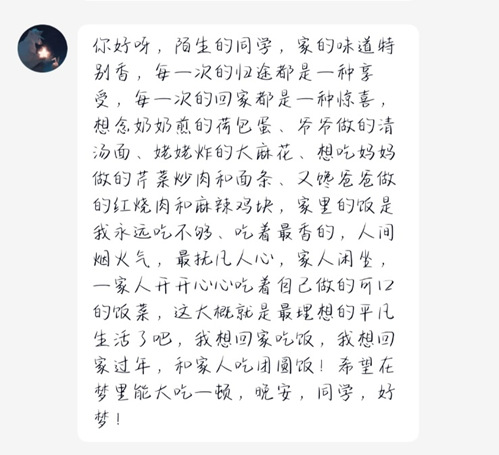 晚安计划的策划不到一周,主要按照话题展开,其中“梦”“家”等主题,同学们的参与度很高。 最终晚安计划成功成为校级活动,活动收到1200多份晚安问卷,参与人数达一百多人。他提到,感受到了大家发出消息的激动,等待收到晚安的期待。投身其中,同学们互相支持,快乐的气氛感染到他,让他非常感动。