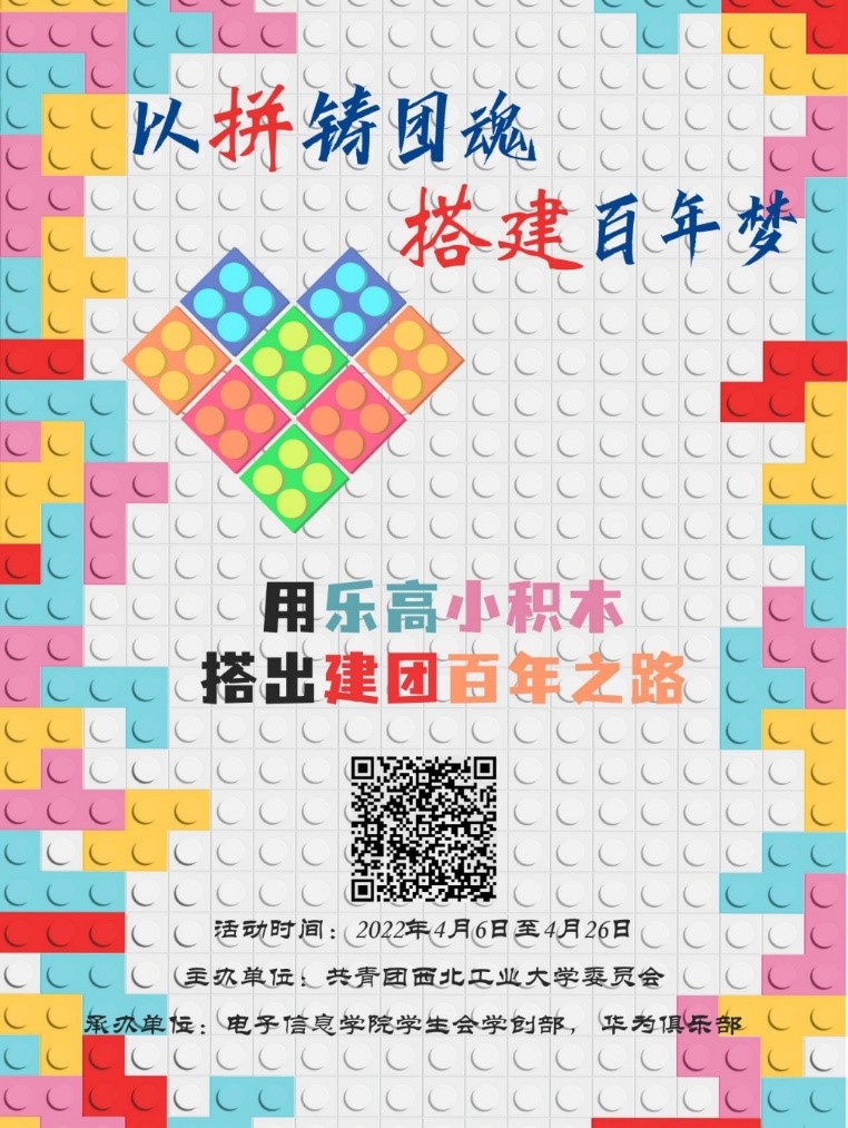 桃红柳绿春风暖,莘莘学子汇长安。在这春意盎然的四月,足球赌注网站IF创想工坊,以“拼”铸团魂,“搭建”百年梦--积木搭建活动正式拉开帷幕。2022年正值中国共青团建团100周年,对于团的百年建设、发展与壮大历程,相信同学们都有着切身体会和深刻认识,心中是否也燃烧起创作的激情呢?本次活动便为同学们提供了一个自由创作的平台:参赛者以简单的乐高小颗粒积木为原材料,在规定时间内创作出富有时代感的作品,并在指定的时间内交到足球赌注网站统一进行打分,评委会从中评选出富有新意、充满活力的优秀作品。同学们,还在等什么,快来尽情挥洒自己的灵感吧!