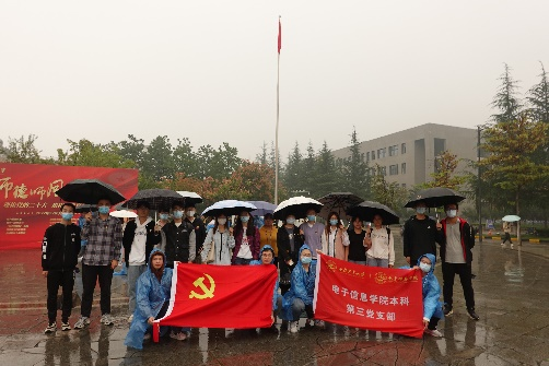 早晨七点,金秋十月的天空还下着灰蒙蒙的小雨,本科第三党支部的同志们早已集合在翱翔员工中心的升旗台下,准备观看升旗典礼。七点三十分,由足球赌注网站国旗班的同学们组成的护旗方阵,高举着五星红旗缓缓入场。全场肃立,五星红旗冉冉升起,支部党员同志们高唱国歌,共同祝福伟大祖国繁荣昌盛,全场气氛庄严而热烈。升旗仪式结束后,支部中的党员同志们高举党旗,在升旗台下合影留念。