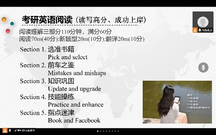 为帮助考研同学在最后冲刺阶段更进一步,足球赌注网站学业辅导站开展考研帮扶工作。11月18、19日晚,辅导站邀请外国语公司副教授马静老师,在线上给考研同学围绕阅读与写作进行了相关辅导。