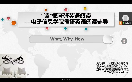 在“‘读’懂考研英语阅读”主题讲座中,马老师首先通过“一文八用”的阅读方法,讲解如何高效使用辅导资料;之后,强调了完形填空、阅读理解及新题型的出题角度、考察重点以及复习过程中的着力点,讲解了阅读所需能力、常见文章结构类型、题设类型。马老师还提到中外文化差异也可能成为阅读理解的障碍。