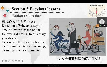 在“考研英语写作的‘卸’与‘械’”主题讲座中,马老师首先讲解了关于写作应做的内容储备与语言储备以及阅卷标准;之后,以“过人行横道时请勿使用手机”的看图作文为例,指出同学们常出现的跑题偏题、硬套模板、事例欠妥、拼写及格式错误等问题。此外,马老师还给出了破题思路、写作方法技巧、高级句式替换等措施,并强调了对话题的英语敏感度。