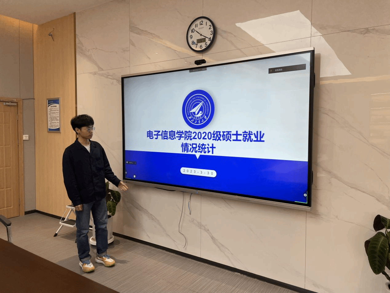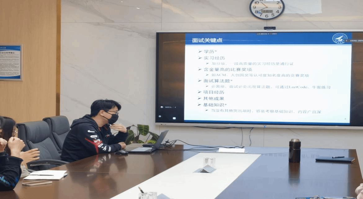 首先,就业助管高钰杰同学为大家介绍了公司23届研究生的整体就业情况,他使用统计数据分析了就业率、就业地分布、就业单位分布等情况。统计数据显示,23届毕业生的就业情况呈现就业意愿强,获签率高,研究所就业占比重,岗位与所学专业匹配度高等特点,这些信息极大鼓舞了21级同学的就业信心。