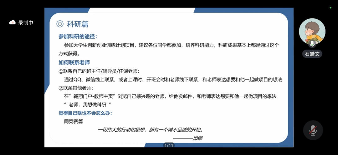 2020级本科生雷光宇先进行分享,他从如何合理树立目标、学习侧重点普及以及注意事项等方面进行分享。从保研、考研、出国、本科就业四个方面出发,针对不同的目标分享了不同的学习侧重点,随后他针对考试,竞赛等方面进行了介绍,并建议大家学习竞赛两手抓,同时也最好拥有1-2段科研经历,不要让英语成为后腿项。