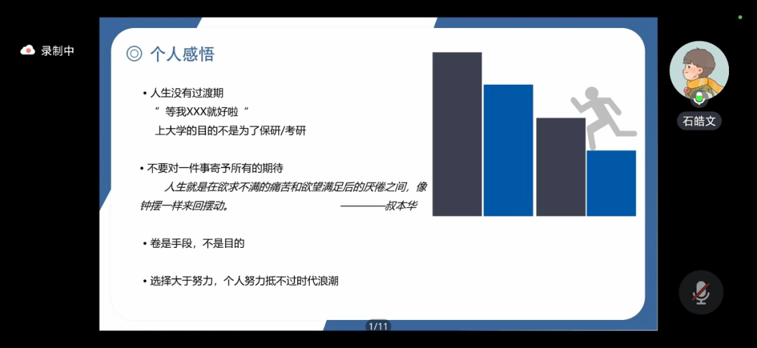 随后是2020级本科生石皓文进行分享,他先介绍了足球赌注网站2020级本科生目前的保研情况、不同专业的保研率以及获得保研资格的方法,再以员工角度从学习、竞赛、科研三个方面展开分享自己的经验。最后他分享了他的个人感悟,告诉大家人生没有过渡期,上大学的目的不是为了保研考研,告诉大家要在学习的同时感悟自己的老员工活。