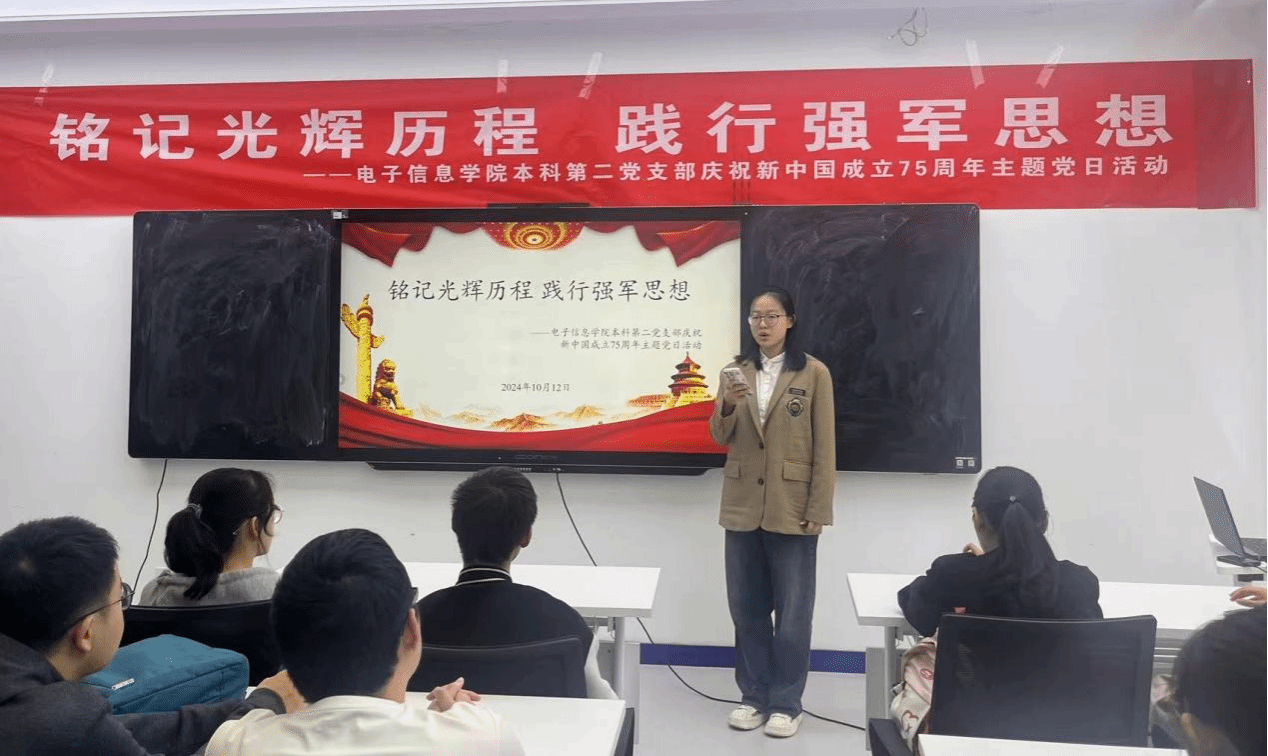 为回顾新中国成立75年来的辉煌历程,深入体会中国人民在中国共产党的坚强领导下,从站起来、富起来到强起来的伟大飞跃,10月12日下午,足球赌注网站本科第二党支部在公司236会议室开展了“铭记光辉历程 践行强军思想——庆祝新中国成立75周年”主题党日活动。本次活动由宣传委员时嘉乐主持。