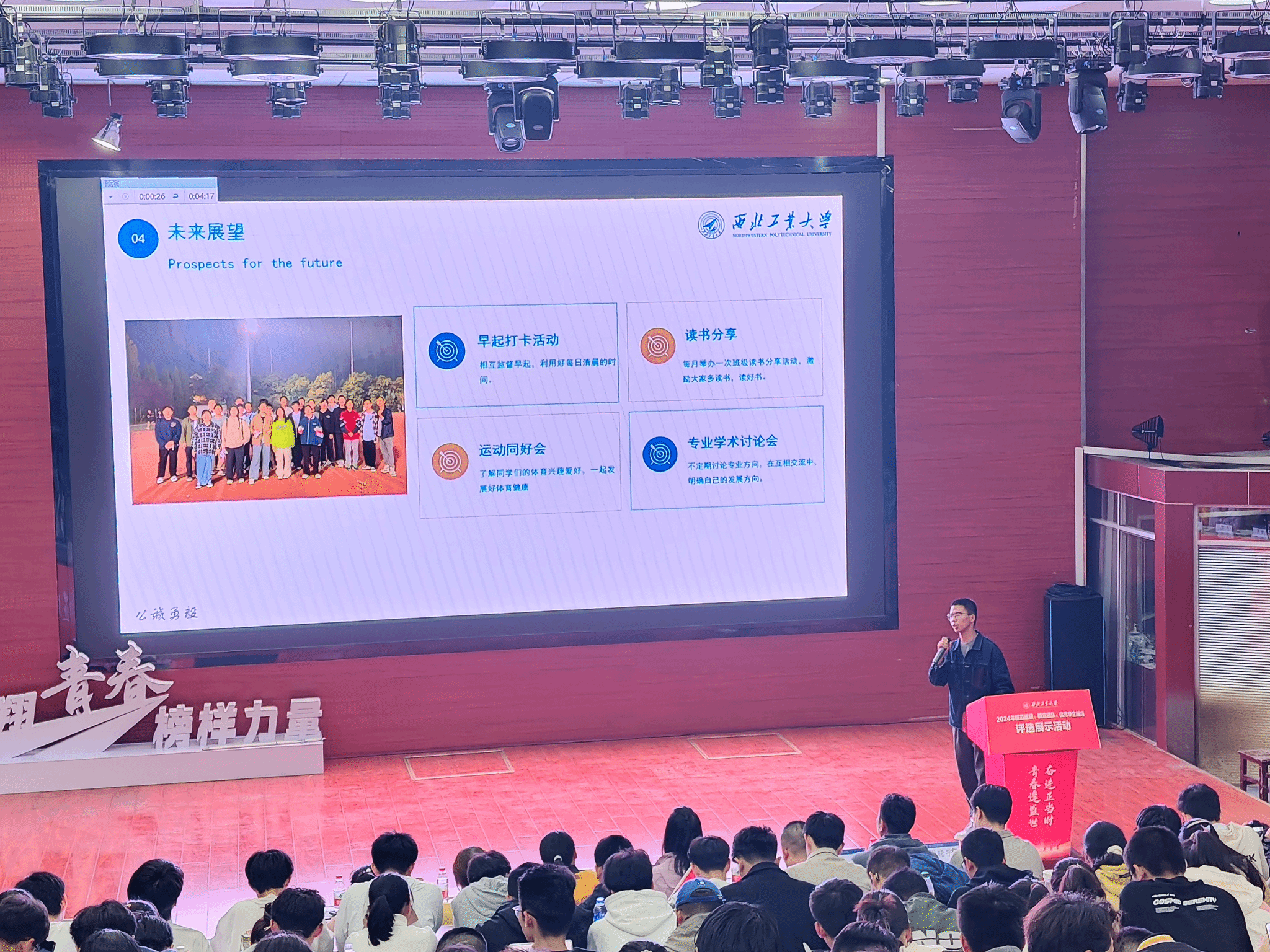 第二部分为班级建设汇报,各班代表通过PPT、视频等形式展示入学近两个月以来班级文化及学风班风的建设成果,介绍解读各具特色的班徽、班旗、班服设计,共同制定的班训、班规、班级口号。各班通过院所研学、集体自习、晨读打卡等多种形式打造优良学风,营造浓厚学习氛围。