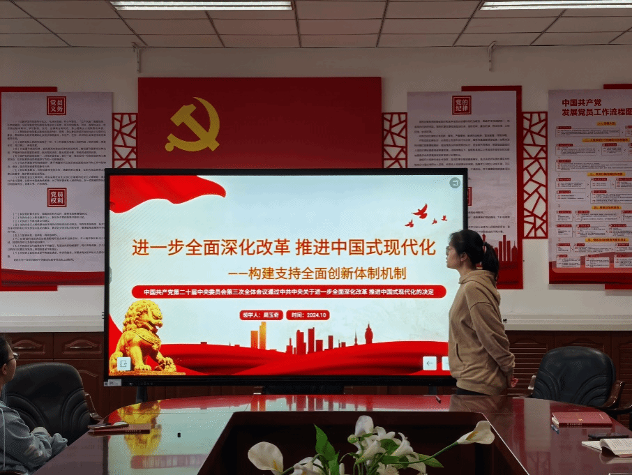 周玉奇同志以“构建支持全面创新体制机制”为主题带领支部党员学习。她讲到,党的二十届三中全会提出,教育、科技、人才是中国式现代化的基础性、战略性支撑。必须深入实施科教兴国战略、人才强国战略、创新驱动发展战略,统筹推进教育科技人才体制机制一体改革,健全新型举国体制,提升国家创新体系整体效能。随后,她回顾了党的二十大报告中对教育、科技、人才的统筹部署,结合自身本科学习、推免经历和公司公司产品、科技创新相关措施和成果,详细介绍了党的二十届三中全会提出的教育体系、科技体制、人才发展机制三方面的改革举措。同志们也感受到了教育体制、科技创新和人才发展对现代化建设的重要意义。