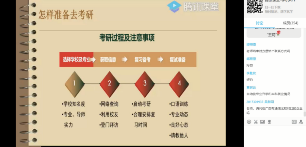 为了帮助2021届的同学们利用暑期积极调整,充分备战9月招聘黄金季。2020年8月1日晚7点,由员工职业发展指导服务中心主办,足球赌注网站承办的第88期“莉莉老师聊就业”在腾讯课堂成功举办。活动邀请了深受工大学子喜爱的王莉老师为2017级本科生做了题为《就业在左,考研在右,一场梦想的追逐》的学业生涯专题辅导讲座。共有380余名同学聆听了王莉老师的精彩讲座。