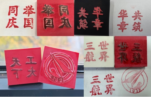 随后,由公司员工雕刻协会负责人王皓然讲授橡皮章雕刻技巧。王皓然同学从制作实践出发,深入浅出地讲解了雕刻的基本原理、执刀手法、雕刻技巧等内容,并以“中”字为例为同学们演示雕刻过程,并鼓励大家要科学操作,也要敢于实践。随后,同学们按照讲解内容进行练习体验,利用橡皮章刻制了“共筑华章”“盛世中华”“国泰民安”“天下工大”“世界三航”等内容。