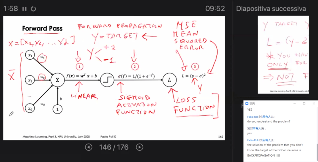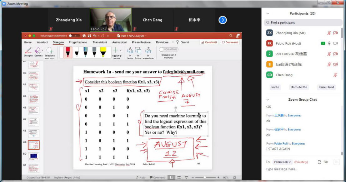 Adversarial Machine Learning /对抗机器学习暑期课程共32学时,Roli教授的授课在Zoom会议软件上进行,授课进行了3周,每周工作日有4天的下午3:00到5:30(北京时间,罗马时间早9:00-11:30)在线授课。他的讲课将机器学习基础知识和对抗学习前沿研究相结合,共分为4大部分内容:1)介绍课程主要内容,同时讲解机器学习的基本概念和任务流程;2)从贝叶斯决策理论和高斯模式分类器入手,讲解统计学习方法的理论基础;3)通过讲解分析机器学习分类器设计中不同的损失函数,从优化理论的角度将简单线性分类器过渡到深度神经网络,并讲解了卷积神经网络(CNN)的结构含义;4)从一些现实中的机器学习分类错误的例子引入,讲解对抗学习的基本概念、理论基础、应用领域和研究趋势。整个讲课过程中,Roli教授与员工全英文互动进行问答,在每一个知识模块讲解完成后都会询问员工们是否理解明白,没有全部理解的部分Roli教授会耐心地详细讲解。在一些数学推导内容较多的部分,Roli教授会亲自板书推导相关内容以便同学们理解;在一些介绍一些机器学习框架时,Roli教授还会介绍相关编程框架及附上网站链接,方便同学们课下自行实践学习。