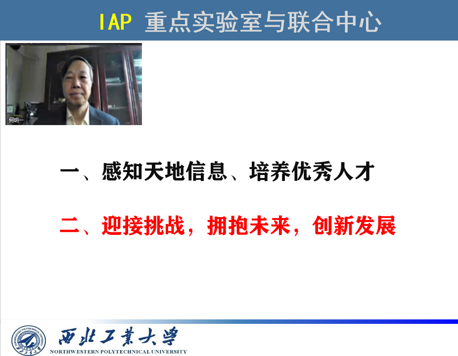 IAP实验室创始人、中心主任何明一教授应邀为同学们上了“最后一堂课”。何明一老师首先简要回顾了IAP信息获取与处理重点实验室及国际联合研究中心的创立、发展及在公司产品中的作用,祝贺同学们在参与IAP“感知天地信息、培养优秀人才”的实践中取得的优秀成绩和顺利毕业。何老师与同学们共话美好校园与实验室生活,为同学们在信息获取与处理领域的学习、研究取得的进步和成绩感到非常欣慰!何老师寄语同学们“迎接挑战,拥抱未来,创新发展”。他对同学们提出了几点具体的期望:一是要有责任感和善良心,二是要在今后工作中传承和弘扬西工大“三实一新”校训精神,三是要坚持信念、顺应时代、拥抱未来、积极加入到新时代国家建设与发展的行列,努力实现自己的理想。最后,何老师深情地对毕业生们说:“这里是你们的家”,实验室和中心以后还将继续为你们提供可能的支持和帮助,也欢迎你们“常回家看看”。