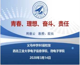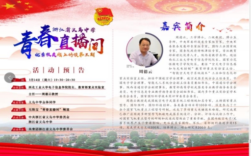 为保障新冠肺炎疫情防控期间本科招生宣传工作的顺利开展,根据教务处招生办线上招生宣传工作方案,足球赌注网站积极探索招生宣传新途径、新方法,发挥线上优势,利用线上社交平台开展招生宣传工作。3月14日晚19:30-20:30,足球赌注网站经理周德云教授(义乌中学81届员工)做客义乌中学“青春直播间”,线上与义乌中学全校员工分享了以“青春、理想、奋斗、责任”为主题的宣讲报告,并通过在线访谈、在线互动交流等环节,指导同学们在延迟开学期间合理有序地安排生活,在网络学习中科学高效地利用学习时间,并为未来生涯规划提供方向。