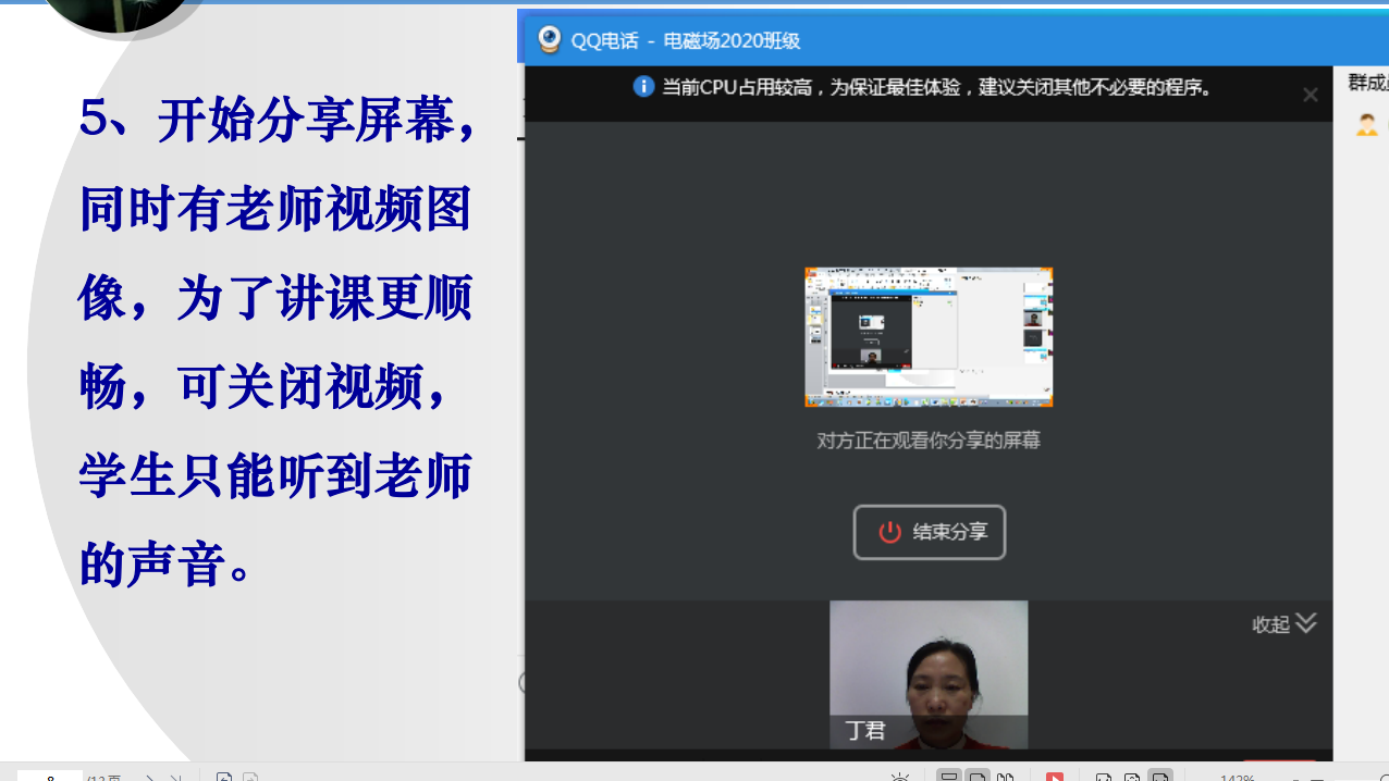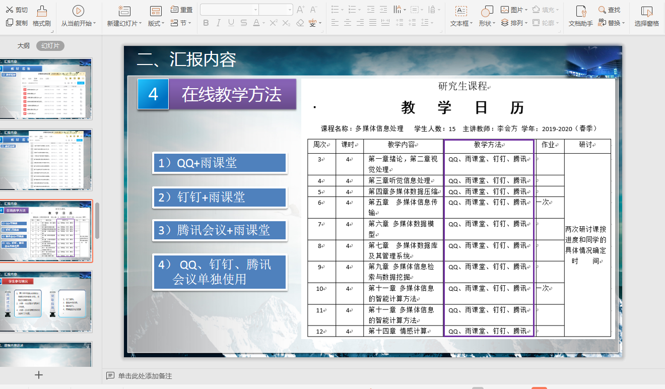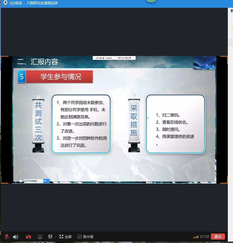 为保证在线课程教学质量,公司成立了在线教学督导组,根据课程开设实际情况分配督导任务,每门专业课都配有一名督导老师和教学主任同时进行督查,实现对公司开设课程全覆盖,公司教学督导组与公司在线督导组形成联动机制。本学期全体专业课任课教师根据线上教学要求,建立了班级授课QQ群,在各课程平台上完成建课和教学资料上传工作,任课教师积极主动参加公司各项平台操作培训、旁听研究生院组织的公共课试讲以及在线教学交流会,大家互帮互助,群策群力,不断丰富线上教学手段。特别是丁君教授还自己总结出一套QQ教学方法,做成PPT后分享给全院老师,受到广泛好评。线上课程教学安排准备也非常充分,得到公司督导肯定。《多媒体信息处理》课程主讲教师李会方教授,在正式开课前与员工认真进行了多次测试,准备了4套不同平台授课方案,精挑细选了各类丰富课辅资料供员工在线学习。《多核处理器架构与高速信号处理》主讲教师吕国云副教授,针对课程内容对各阶段学时做了精细划分,细致梳理了各章节重点及学习要求,准备了多种互动教学方式,试讲时流畅通顺、一气呵成。充分的线上教学准备,有力保障了课程教学工作的顺利开展。