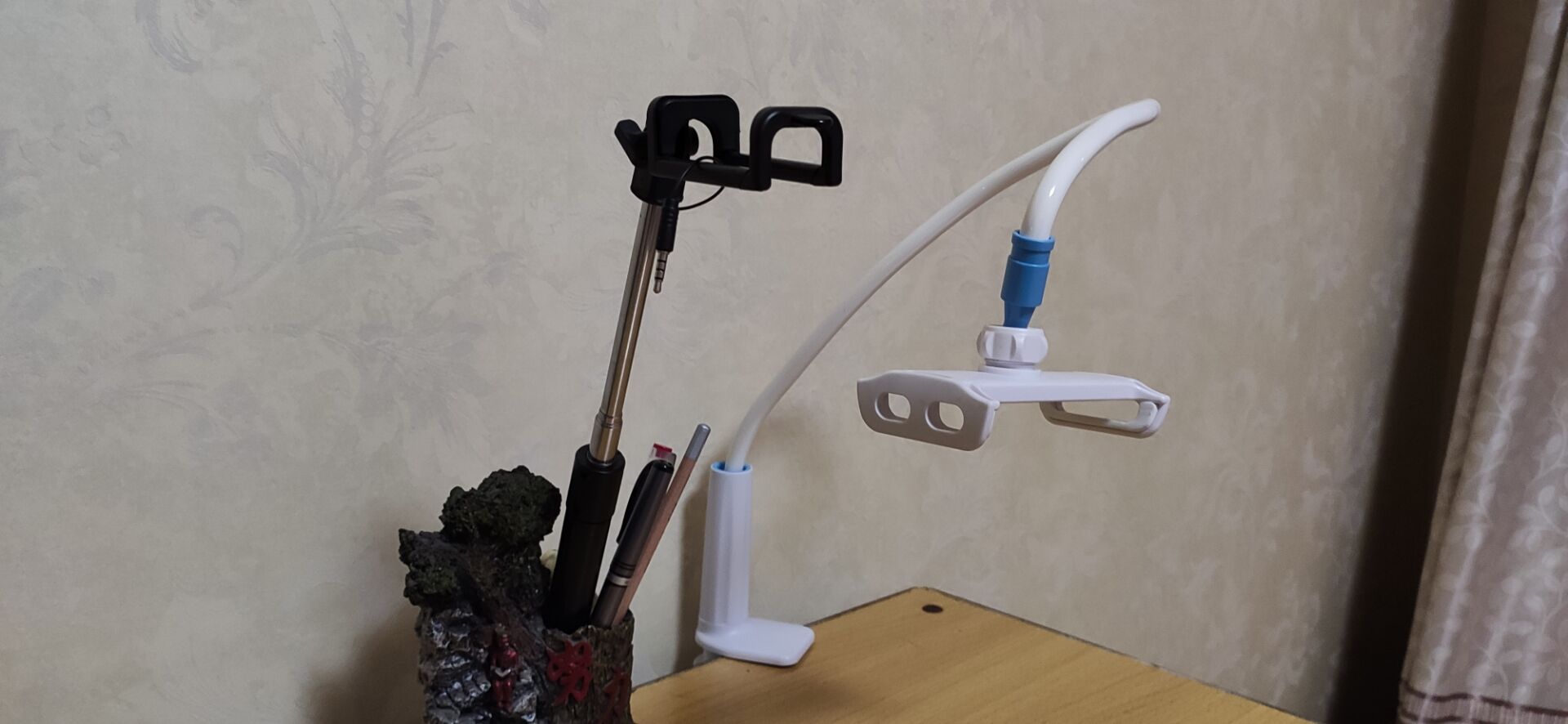 一开始的磨合期是很困难的,主观上来说,新的教学方式对老师有了更高的要求,需要备更多的课,对课堂时间做精准的分配,做更充足的准备;客观层面上,家里最初并没有直播用的工具,是后来家里人灵机一动拿出自拍杆改造成直播架才解决了这个问题,而为了保持课堂效果的稳定,母亲需要找家中最安静也是网络信号最佳的地方直播,这又让我们费了一番脑筋。