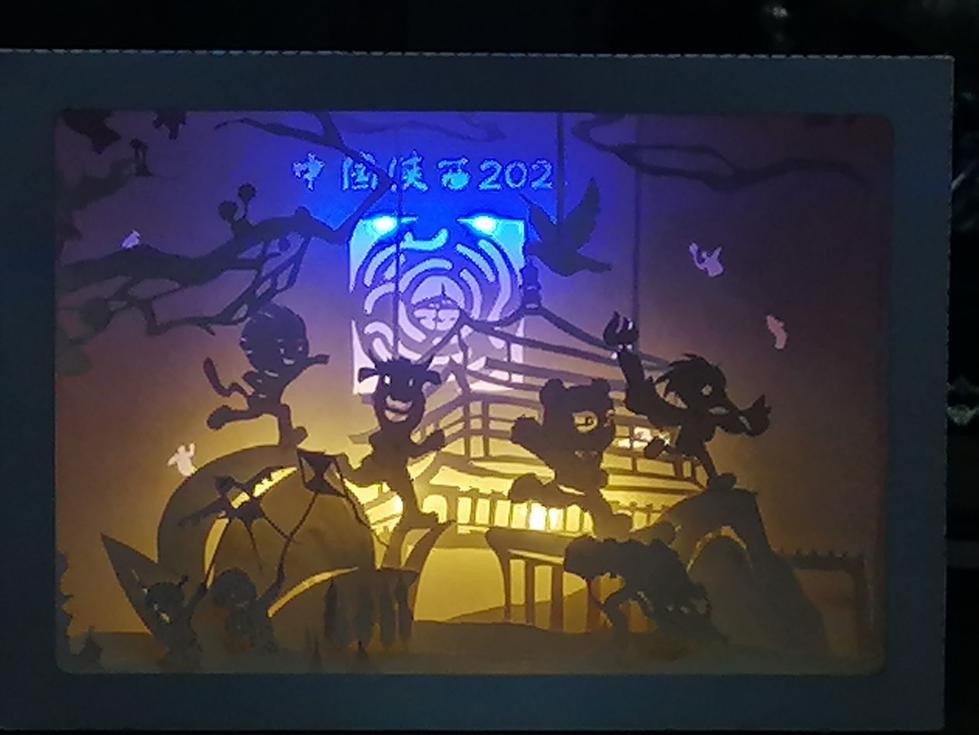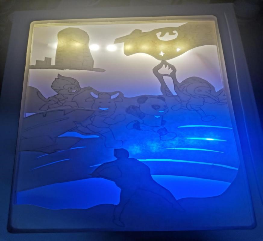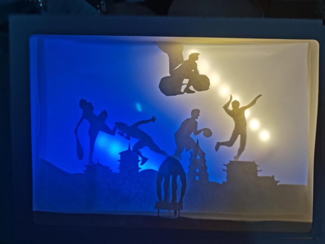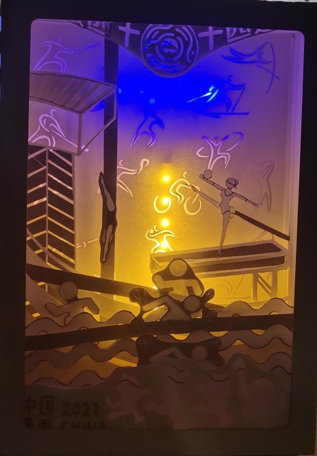 作品简介:作品以十四运为主题,通过纸雕的形式体现了本次运动会的标志、吉祥物、举办地点和比赛项目,同时采用了可动机关的形式展现了游泳、田径、体操和跳水的比赛内容,增强了作品的观赏性与趣味性。