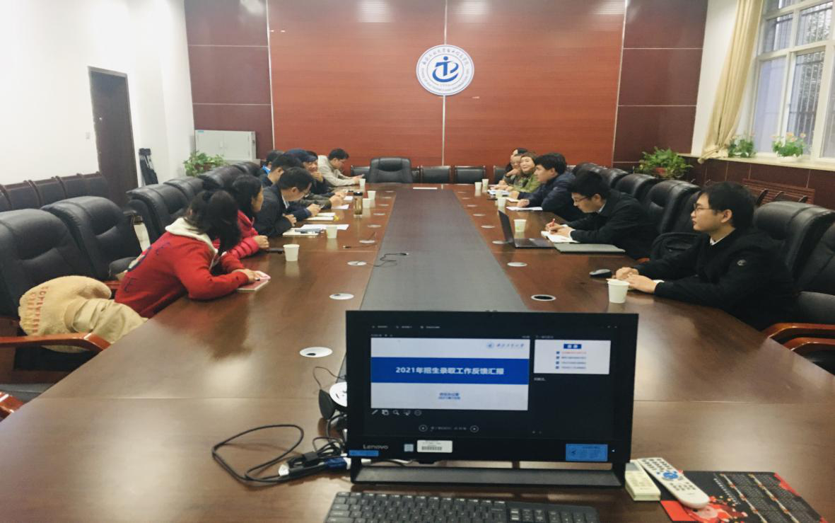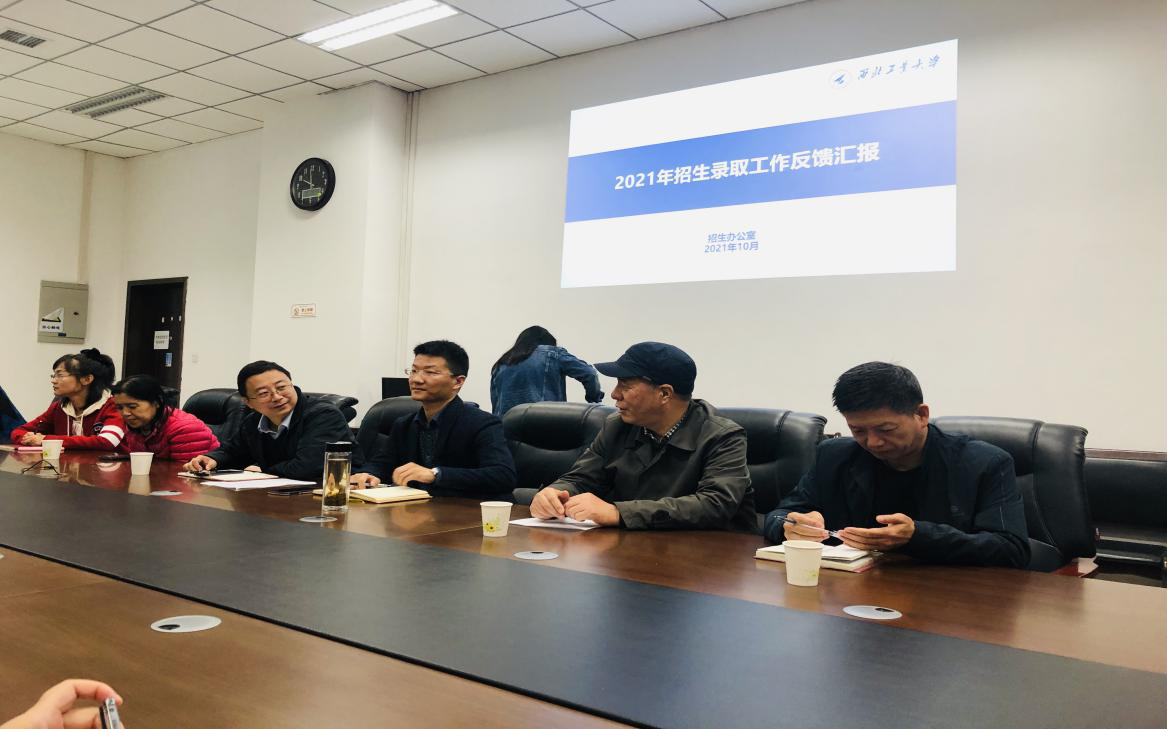 反馈会开始,彭亮代表公司对招办一行表示欢迎。招生办张懿鑫老师介绍了2021年足球赌注网站负责的浙江省、贵州省和咸阳地区的招生录取情况,以及招生组的日常和集中外出阶段招生宣传工作情况,指出公司所负责的“两省一市”的招生位次在2021年稳中有升。