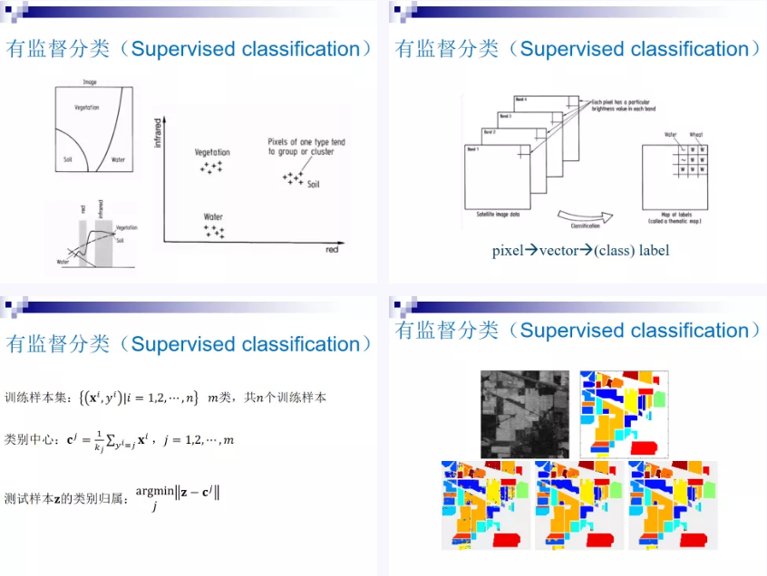 课程介绍分类问题中训练样本和测试样本的含义,明确分类问题的目标就是为测试样本指定类别标签,然后通过成语“物以类聚”阐明分类问题的核心:将特征相似的样本归为一类。课堂上,用员工在线性代数中学到的特征向量来表示样本的特征,训练样本即可获得每一类别的类别中心(特征向量的均值),根据测试样本特征向量与各类别中心的欧式距离决定其类别归属。这种被称为最小距离分类器的有监督分类器,正是通过线性代数中的向量基本运算来实现分类的。