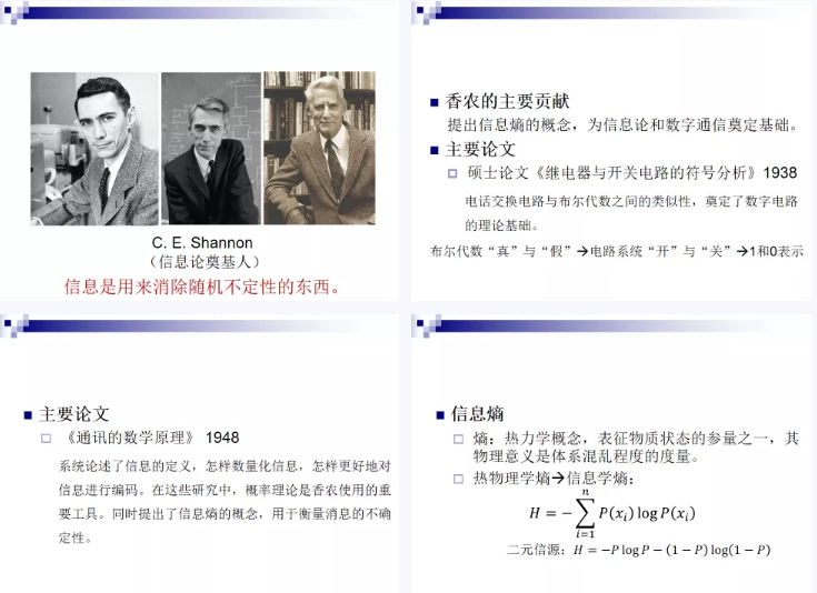 香农在其1938年的硕士论文《继电器与开关电路的符号分析》中,研究了电话交换电路与布尔代数之间的类似性,将布尔代数中的“真”与“假”同电路系统中的“开”与“关”关联起来,进而用二进制数1和0表示,从而奠定了数字电路的理论基础。在发表于1948年的论文《通讯的数学原理》中,香农采用概率理论作为主要数学工具,系统地论述了信息的定义、信息量化,以及怎样更好地对信息进行编码,并提出了用于衡量消息的不确定性的信息熵的概念。从香农的上述研究工作中不难看出,数学是电子信息专业中重要的研究工具之一。