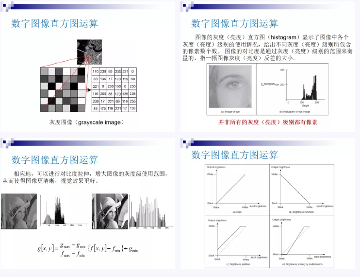 课程首先介绍数字图像灰度直方图的定义和计算方法。数字图像的灰度直方图显示了图像中各个灰度级别的使用情况,给出了不同灰度级别所包含的像素数,是数字图像灰度级别分布情况的一种统计描述。课程展示了灰度直方图分布欠均匀的数字图像,让员工直观感受图像弱对比度的视觉效果。通过建立图像灰度直方图间的线性映射关系,可以对图像进行对比度拉伸,增大图像的灰度级使用范围,从而使得图像更清晰,视觉效果更好。通过展示经过直方图线性拉伸的数字图像,让员工直观感受图像的对比度增强效果。最后,将变换前后图像灰度直方图之间的线性映射关系,拓展至非线性映射关系,并引出函数自变量到因变量之间的映射关系问题,阐明其数学和物理意义。