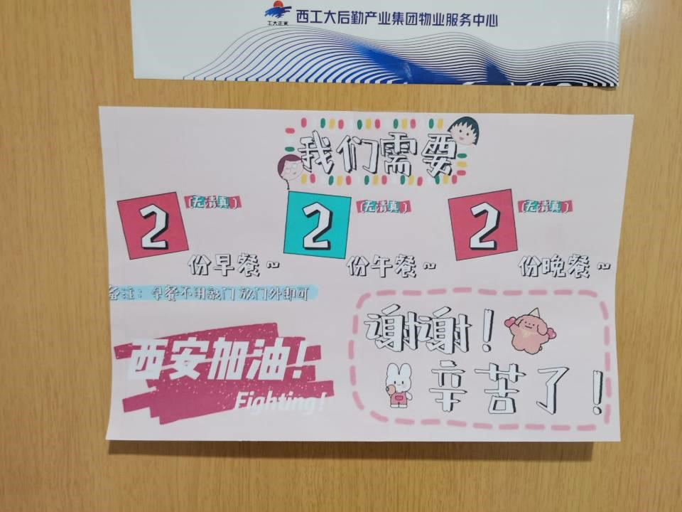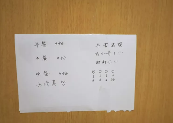 同学们都在自己的宿舍门贴上了温暖的小纸条,写上了所需要的饭菜数量,并且不约而同的表达了对送餐志愿者的谢意,有的画上了可爱的图案来表达感恩,让志愿者可以在重复且劳累的搬运中感到一点点快乐,有的同学不太会画画,简单的语言也让志愿者感到了同学们真诚的谢意,还有同学细心的在门口贴上了口罩,供志愿者方便使用。