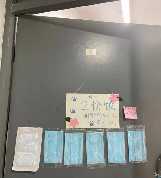 同学们在宿舍门口也放了自己用心制作用来放饭菜的纸箱,并每天分享自己的饭菜盲盒对志愿者和工作人员表达感谢,同时还有每天志愿者送饭时收获的每位同学的“谢谢”和“辛苦了”让志愿者的心中倍感宽慰。