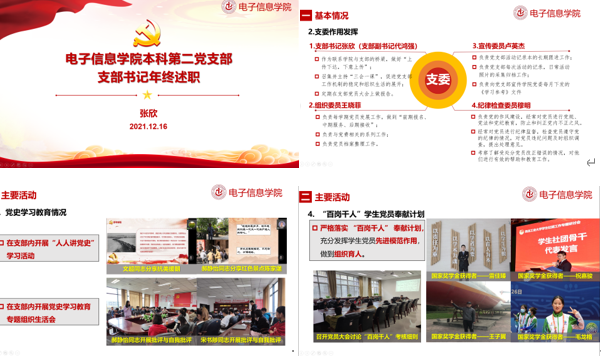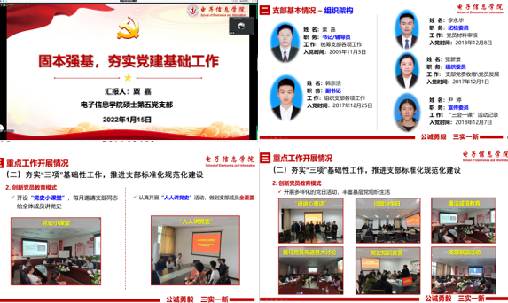 电子信息公司党委副书记彭亮介绍本次考核工作的考核内容和评分标准。本次考核覆盖20个员工党支部,包括5个本科生支部、11个硕士支部和4个博士支部,考核方式采用5分钟PPT线上汇报加3分钟专家点评及提问的方式进行。述职内容包含支部基本情况、支委作用发挥、“三会一课”开展情况、党员发展工作、党史学习教育情况、“百岗千人”活动开展情况、我为群众办实事、支部特色活动及工作亮点、存在的问题和下一步工作计划等。支部书记考核总分由两部分组成,一是根据答辩和述职报告情况专家打分(占总分的90%),二是根据党支部“三会一课”检查情况进行打分(占总分的10%)。