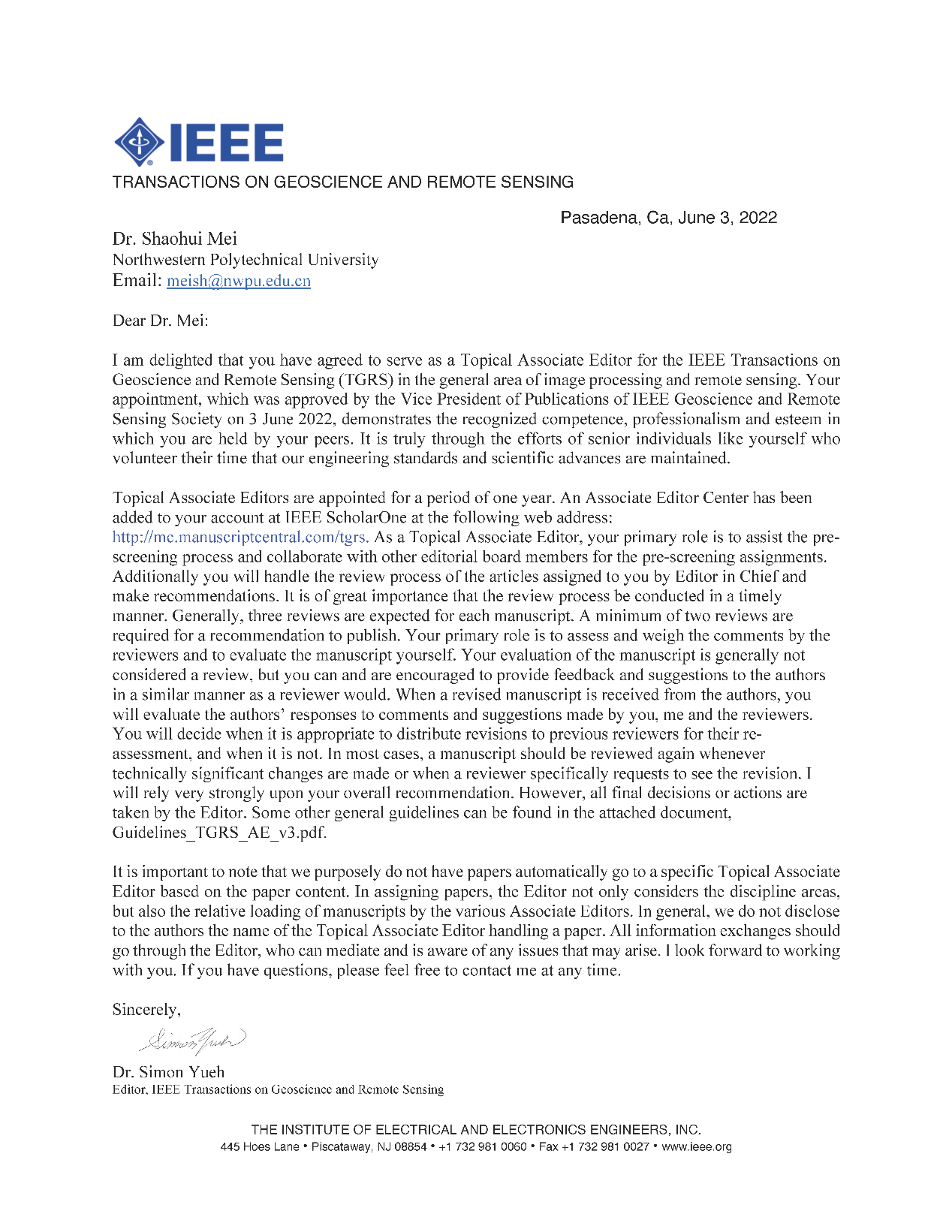 近日,足球赌注网站梅少辉副教授被美国电气和电子工程师协会(Institute of Electrical and Electronics Engineers,IEEE)聘任为旗下学术期刊IEEE Transactions on Geoscience and Remote Sensing (TGRS) 领域副主编(Topical Associate Editor)。