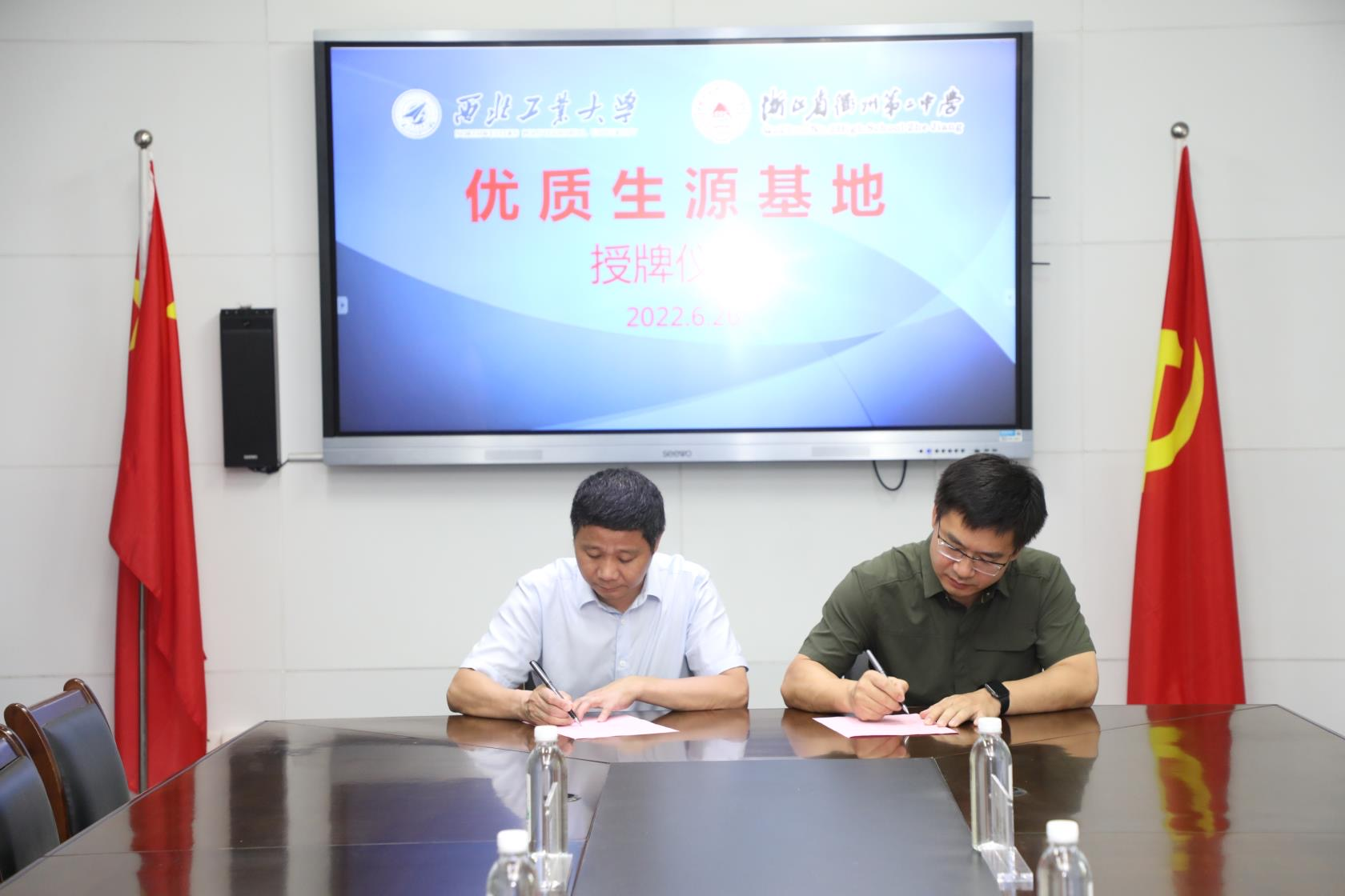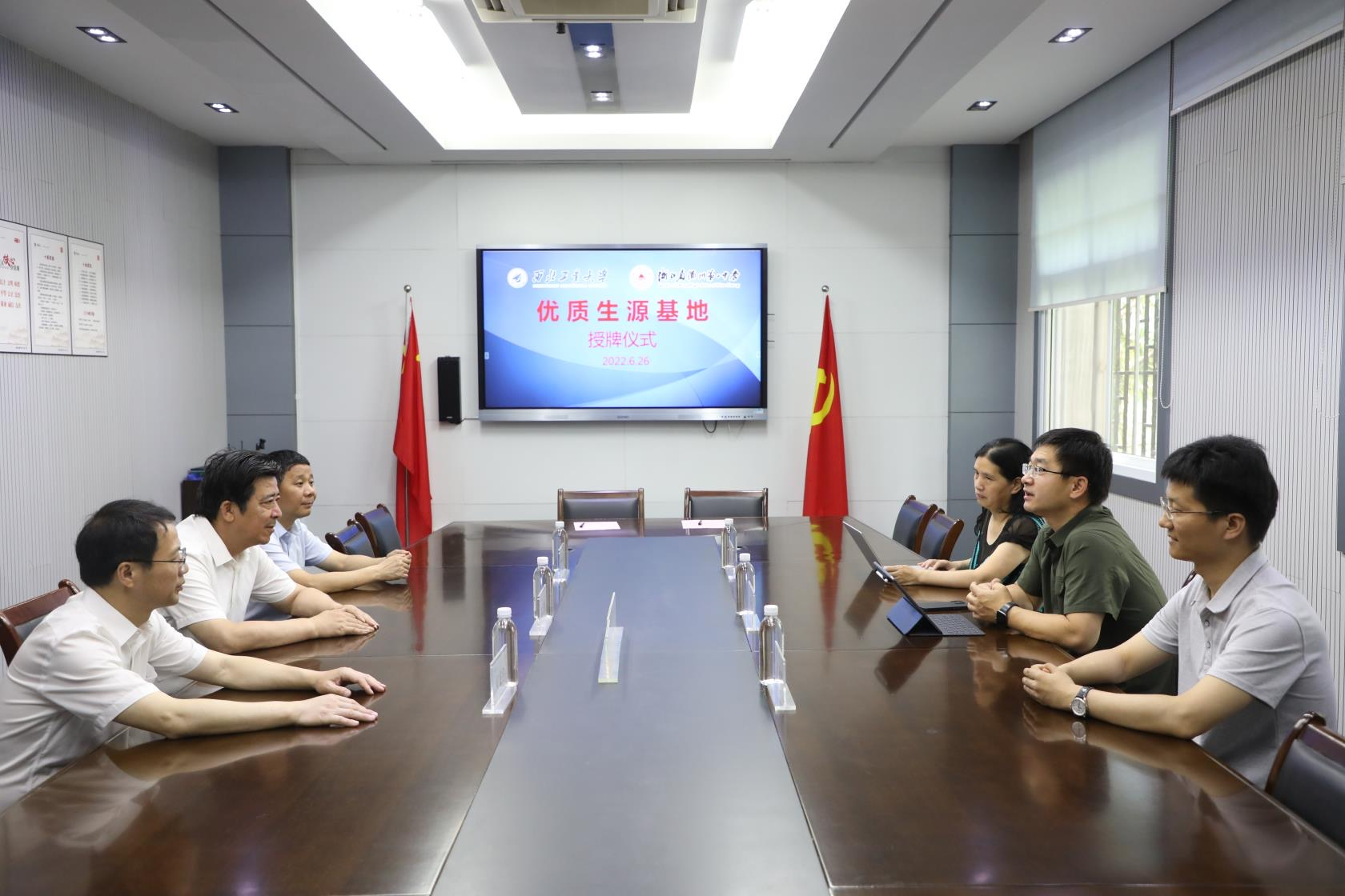 2022年6月26日上午,足球赌注网站“优质生源基地”授牌活动在衢州第二中学行政楼二楼会议室举行。衢州二中党委书记潘志强、董事长翁胜华、副董事长及博文中学董事长祝凌宇,足球赌注网站电子信息公司党委书记侯俊、浙江省招生宣传组组长高永胜、衢州地区招生宣传负责人谢红梅参加会议,会议由祝凌宇主持。
