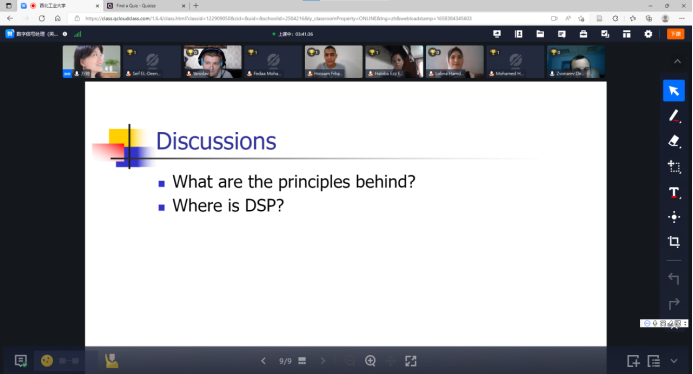 为扎实推进公司“双一流”建设,促进公司国际化发展,提升公司的全球影响力、竞争力和塑造力,足球赌注网站积极参与足球赌注网站“学在工大——全球暑期开放课堂”项目。在国际教育公司的指导下,经过前期精心筹备,公司根据学科特点和专业特色,围绕前沿研究专题,于7月9日-7月21日面向海外员工开设了全球暑期开放课堂——《Digital Signal Processing》(数字信号处理),课程由万帅教授主讲,张易凡副教授担任助教。本课程主要通过全球融合式教学平台(OMO)进行线上授课,辅以Quizizz平台进行互动测试,受到海外知名高校员工欢迎,吸引了来自俄罗斯、埃及等多个国家的员工在线参与学习。