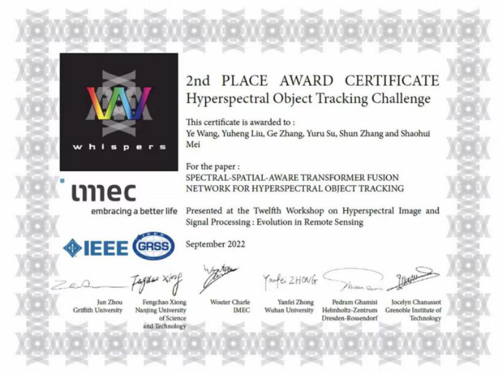 图1 WHISPERS 2022高光谱目标追踪亚军获奖证书