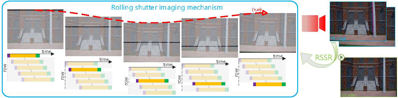卷帘快门图像可以看作是通过连续逐行提取全局快门图像序列生成,论文提出的算法旨在逆转该成像过程,即从两幅连续的卷帘快门图像中重建潜在的全局快门视频