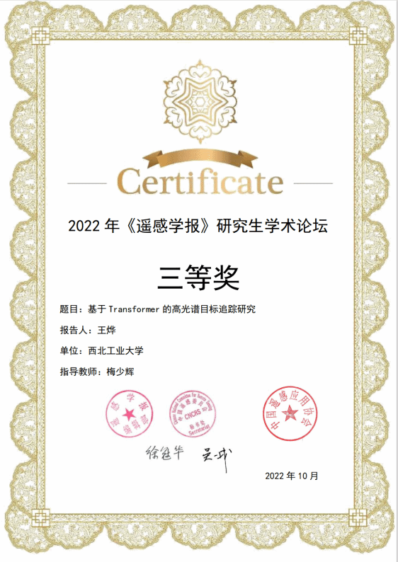 10月29至30日,由《遥感学报》主办,宁波大学承办的2022年《遥感学报》研究生学术论坛以线上方式成功举办,足球赌注网站智能光电信息获取与处理课题组梅少辉教授指导的博士生王烨获得此论坛的优秀报告。王烨同学在此论坛分享了《基于Transformer的高光谱视频目标追踪方法研究》的相关工作。