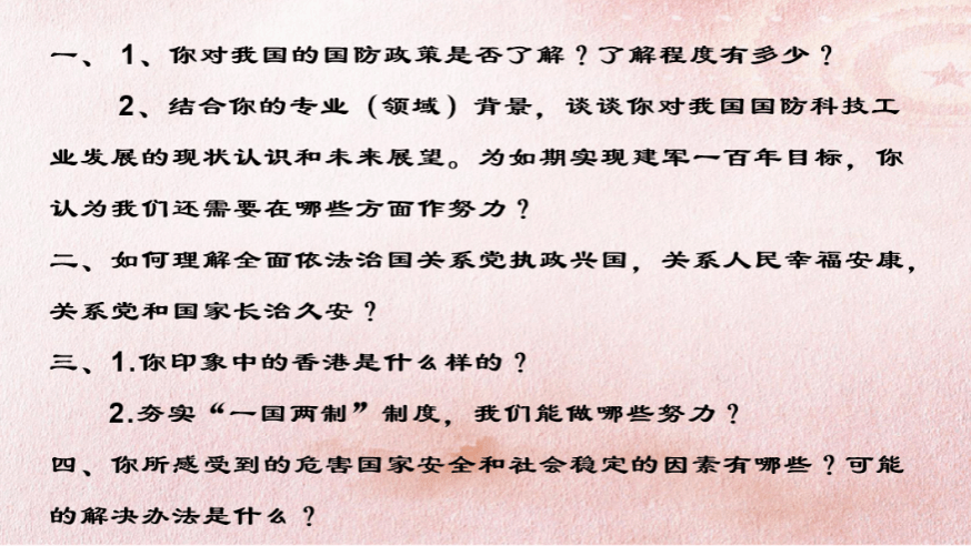 雷光宇同志结合军理及思政课学习内容说明我国现行国防政策以及其政治性、防御性、人民性和自主性的特点;王馨乐同志从电子信息专业领域出发,结合当下我国国防科技工业发展现状及军队发展现状给出现阶段老员工党员投身国防事业的可选途径;周雪琴同志认为在我国社会主要矛盾的变化下,人民群众对法制等方面的要求日益增长,要坚持法治为了人民、依靠人民、造福人民、保护人民,以法治力量更好保障人民群众的获得感、幸福感、安全感;魏浩然同志则描述了自己在新闻报道以及文艺作品中看到的香港地区繁荣市井的景象。
