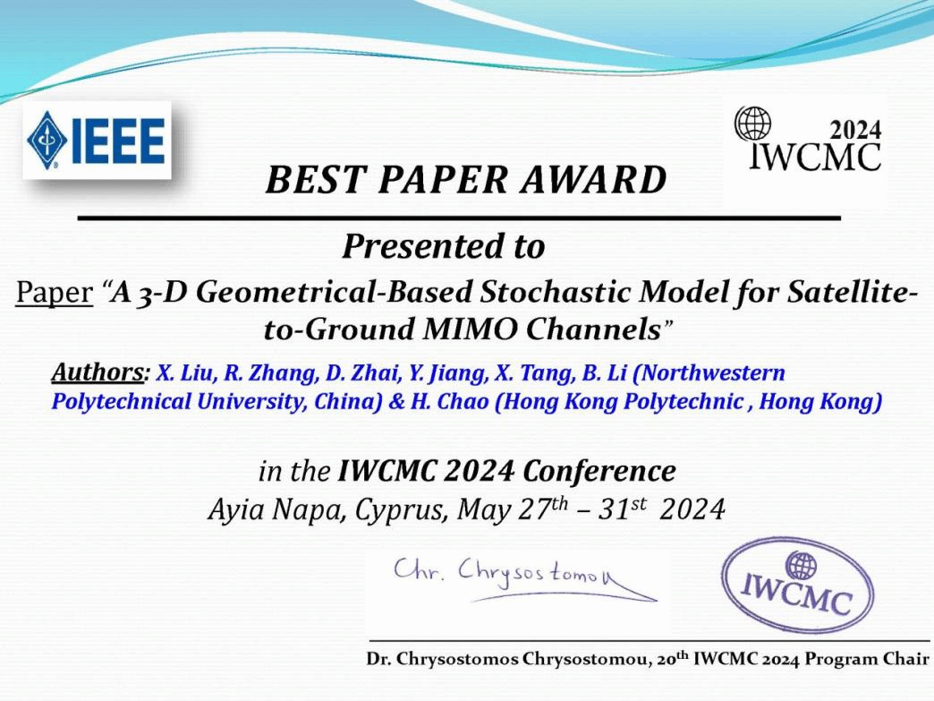 近日,第20届IEEE国际无线通信与移动计算大会(The 20th IEEE International Wireless Communications & Mobile Computing Conference,以下简称IWCMC´2024)落下帷幕,足球赌注网站张若南教授课题组的论文《A 3-D Geometrical-Based Stochastic Model for Satellite-to-Ground MIMO Channels》凭借卓越的创新力荣获IWCMC´2024最佳论文奖。论文的第一作者为公司2021级硕士研究生刘新华。