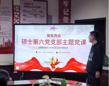 为深入学习贯彻全国两会会议精神,更好地理解政府工作报告, 2024年3月15日晚,足球赌注网站硕士第六党支部在公司432会议室开展了关于全国两会政府工作报告重点解读专题党课。本次党课由硕士第六党支部书记陈爽同志主持,支部全体党员参加。